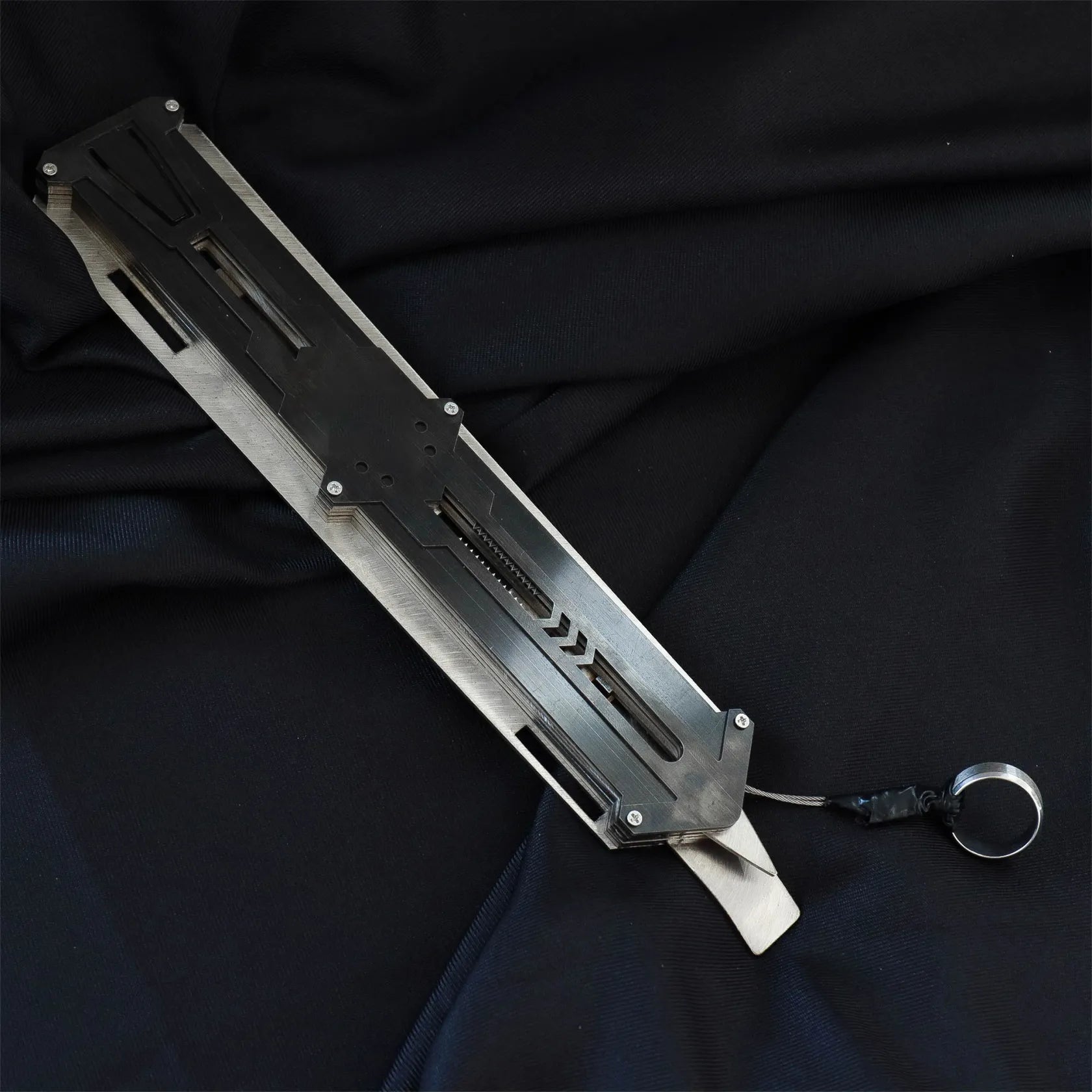The Hidden Blade uses a spring-loaded pull ring for easy deployment. Simply pull the ring to extend the blade. -